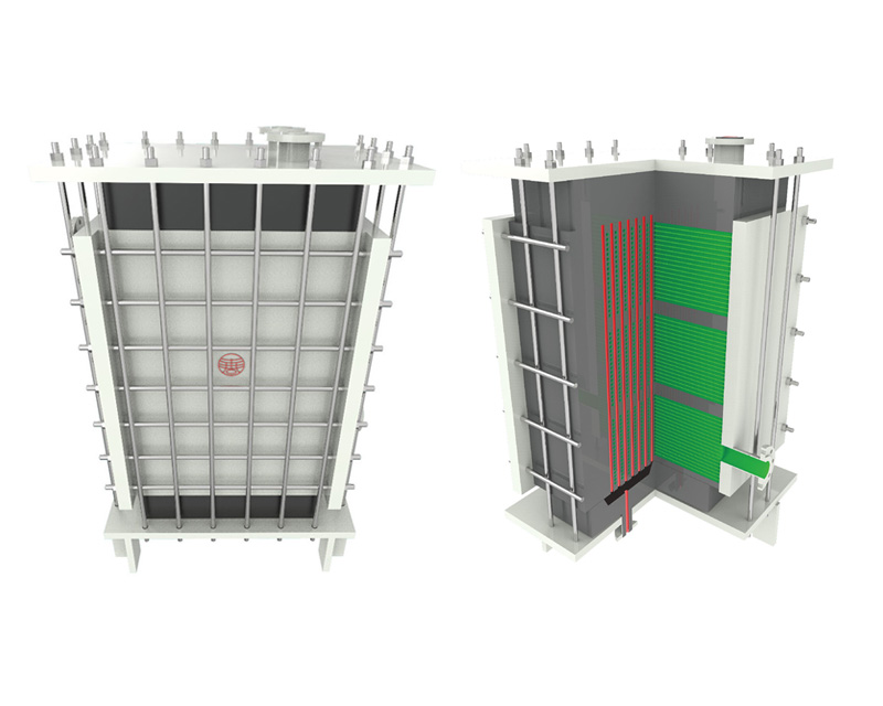 矩形塊孔換熱器有矩形石墨封頭、石墨換熱塊及其間的密封墊片等迭裝組成。因換熱塊僅承受壓力并為整體結(jié)構(gòu)、無膠結(jié)縫,因而結(jié)構(gòu)強度較高,抗沖擊性良好。 水封側(cè)板為鑄鐵板,檢修裝拆簡便。也可制成雙向防腐結(jié)構(gòu)。 該設(shè)備可作加熱器、冷卻器、冷凝器,物料流程為1~4個流程。