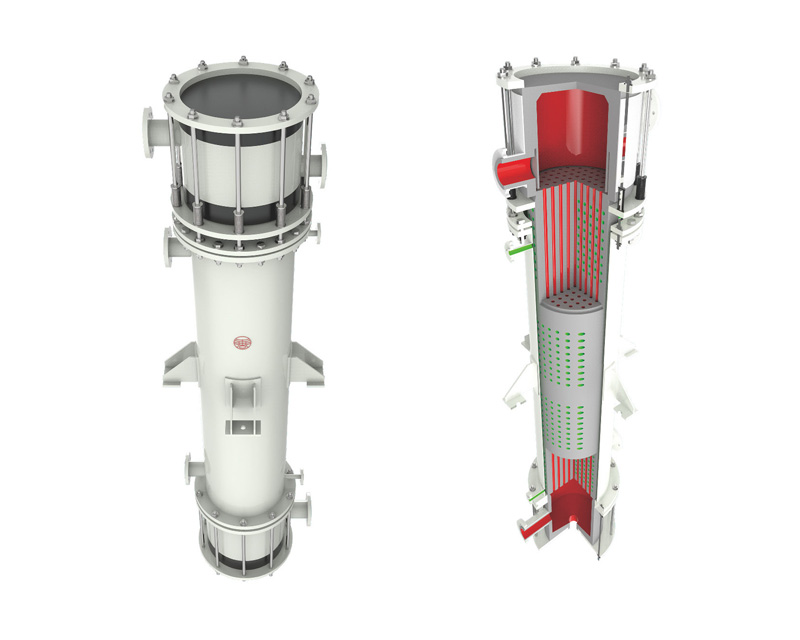 本設(shè)備采用單元換熱塊拼接結(jié)構(gòu),換熱塊之間采用聚四氟乙烯彈性帶密封,設(shè)備整體加裝壓力彈簧作為熱脹冷縮的自動補償機構(gòu)。相對于YKA圓塊孔式換熱器,本設(shè)備頂部加裝吸收塔節(jié),底部加裝汽液分離器。