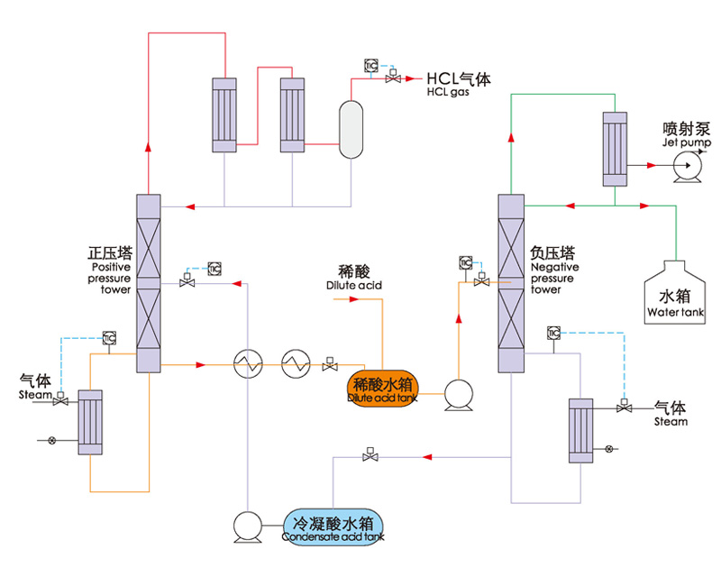 該工藝?yán)名}酸共沸濃度隨壓力的變化而變化生產(chǎn)出HCL氣體。負(fù)壓濃縮鹽酸正壓解吸出HCL氣體。但此方法相比萃取法蒸汽耗高,且投資大。