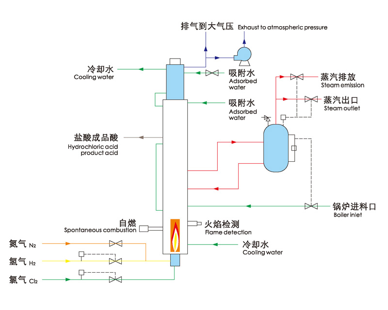 相比較三合一合成爐更具有空間優(yōu)勢,一般適用于小于250MTPD鹽酸的場合。